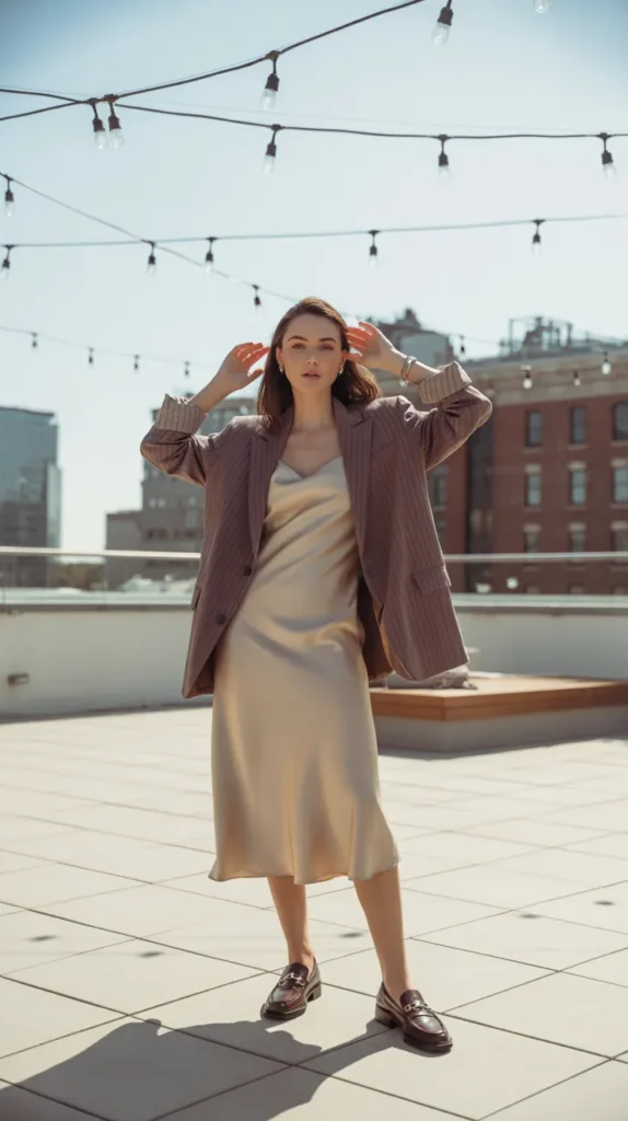 5. Slip Dress Styled with an Oversized Blazer and Loafers