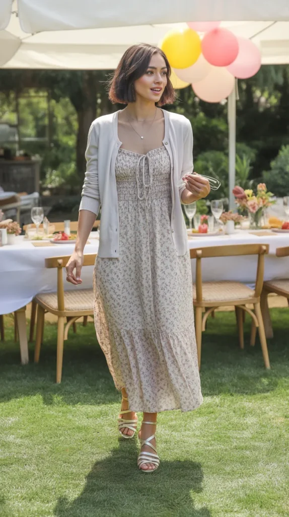 For daytime celebrations, a floral maxi dress is always a win. A light cardigan adds warmth and keeps the outfit soft and approachable. Strappy sandals give it an airy, garden-party feel. Add woven accessories to complete the relaxed chic outfits look. This combo is perfect for outdoor gatherings or springtime parties that don’t need much effort to look put-together.