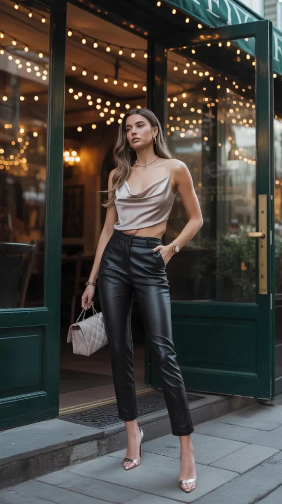 8. Black Leather Pants with a Satin Cowl Top and Heels
