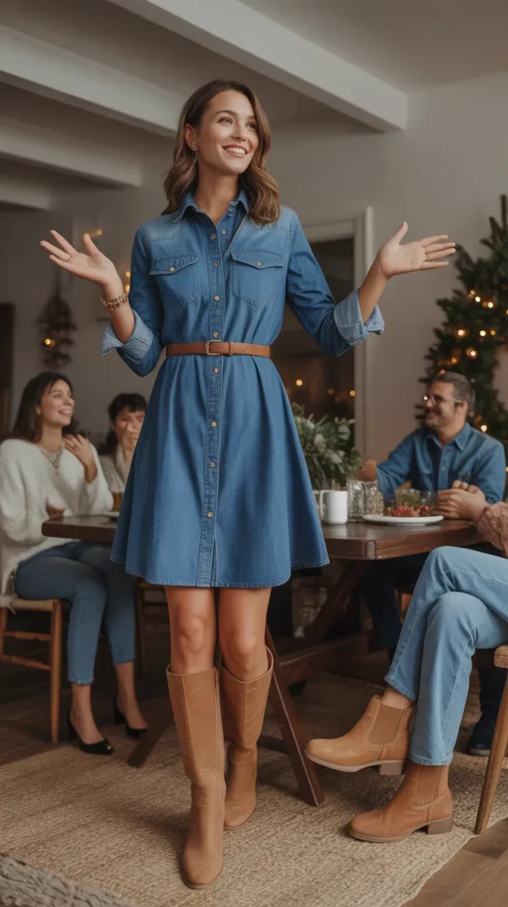 A denim shirt dress keeps things relaxed and easygoing perfect for a house party outfit. Cinching the waist with a leather belt adds instant shape and style. Suede boots warm up the look while keeping it cozy-casual. Hoop earrings and a crossbody make the whole outfit feel ready for mingling. It’s friendly, cute, and perfect for low-key celebrations.