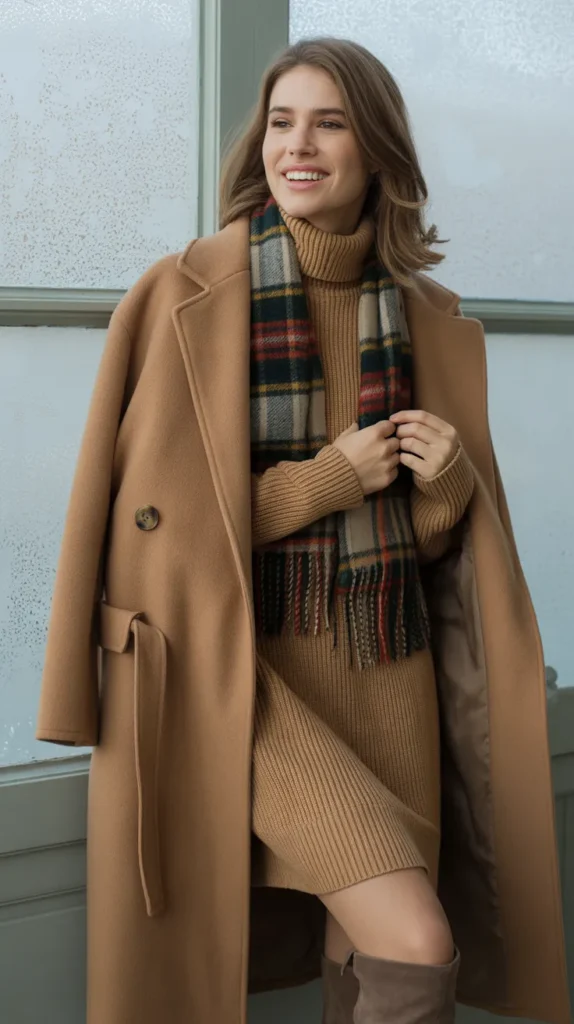 A chunky camel sweater dress layered under a belted wool wrap coat makes the perfect winter outfit. Add suede knee boots and a plaid blanket scarf for that cozy-chic vibe. This casual winter outfit feels effortless yet polished, perfect for holiday shopping or family gatherings. Cold weather outfits like this keep you warm without losing style. A true casual day outfit that nails mode casual charm.