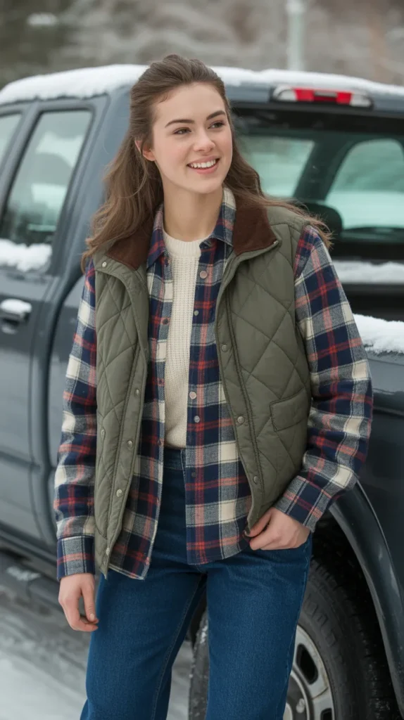 A flannel shirt styled with a chunky cardigan and quilted vest is the perfect winter outfit for weekend plans. Add dark-wash jeans and sturdy boots to complete the vibe. Casual winter outfits like this feel outdoorsy and practical. This is a cold weather outfit that’s as cute as it is cozy. Ideal for cabin trips or chilly strolls.