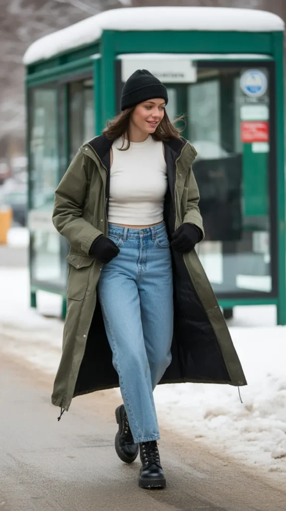 Straight-leg jeans paired with a thermal crewneck and longline parka make a casual winter outfit staple. Add a beanie and combat boots to keep it practical for cold days. This is one of those casual day outfits you can wear anytime. It’s a winter outfit that’s reliable and warm, with a mode casual twist. Effortless cold weather outfits at their best.