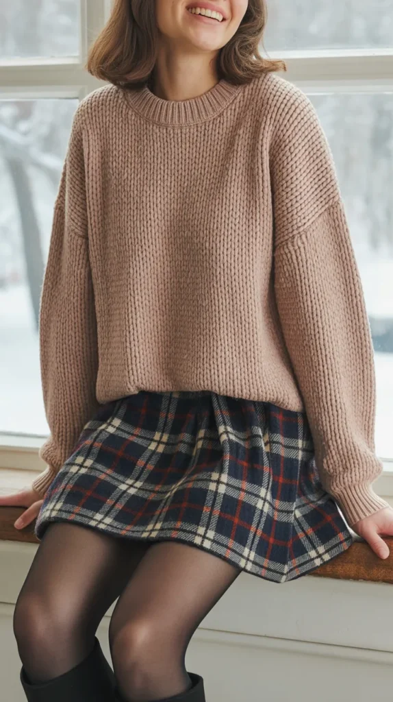 A plaid mini skirt paired with an oversized knit sweater is cozy-meets-cute. Add thick tights and knee boots to stay warm while rocking this winter outfit. Casual winter outfits like this feel fun, feminine, and perfect for seasonal vibes. It’s a casual day outfit that still looks dressed up. Cold weather outfits can totally be flirty and chic.