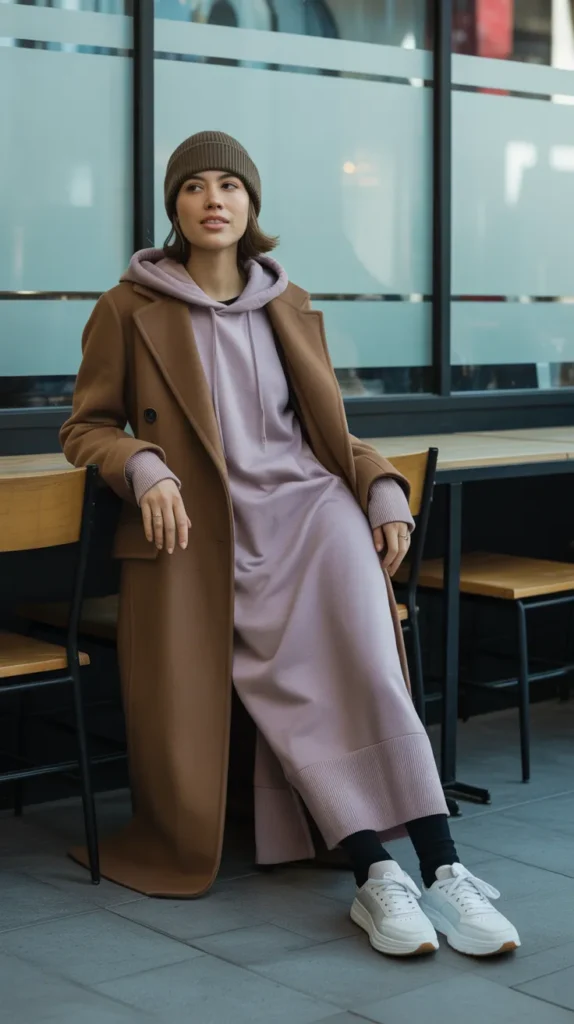 A long cashmere hoodie dress layered with a structured wool coat is chic yet casual. Style with sneakers and a knit beanie for laid-back cold weather outfits. This casual winter outfit is perfect for casual day outfits that need polish without fuss. A winter outfit that’s comfortable and stylish at once. Mode casual with a luxe twist.