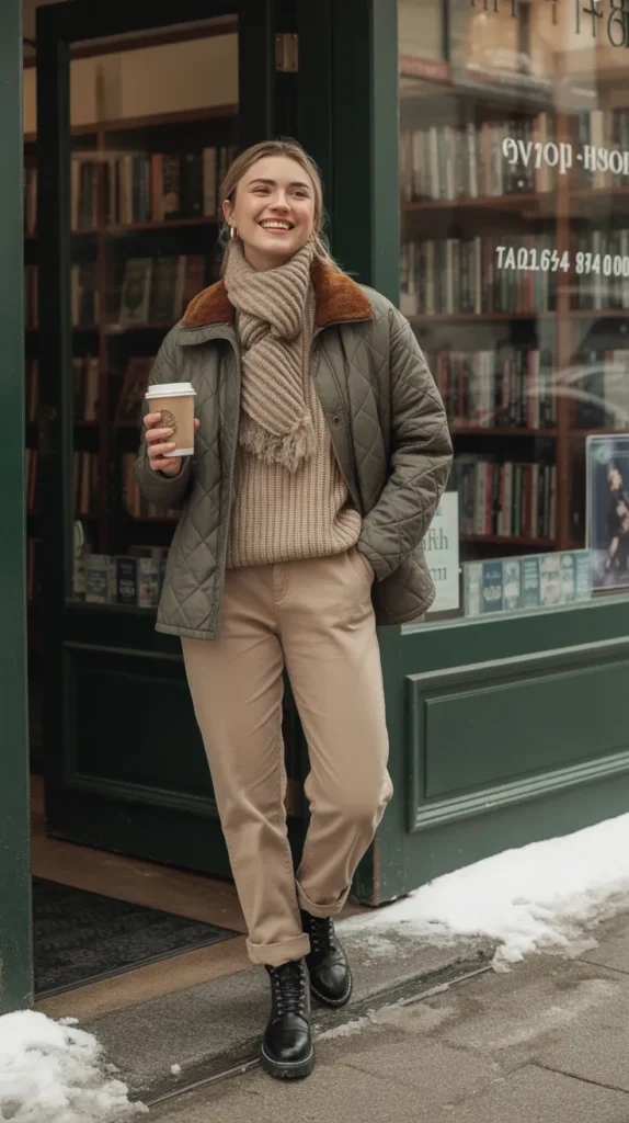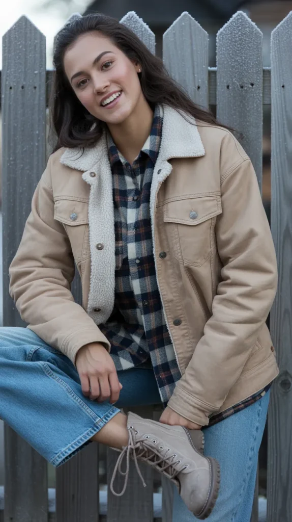Layer a sherpa-lined jacket over a soft flannel shirt for a rustic, cozy look. Straight-leg jeans and rugged lace-up boots make this winter outfit practical for casual days. It’s one of the comfiest cold weather outfits when you want warmth and style. Perfect for outdoor walks or relaxed weekends. Casual winter outfits don’t get more timeless than this.