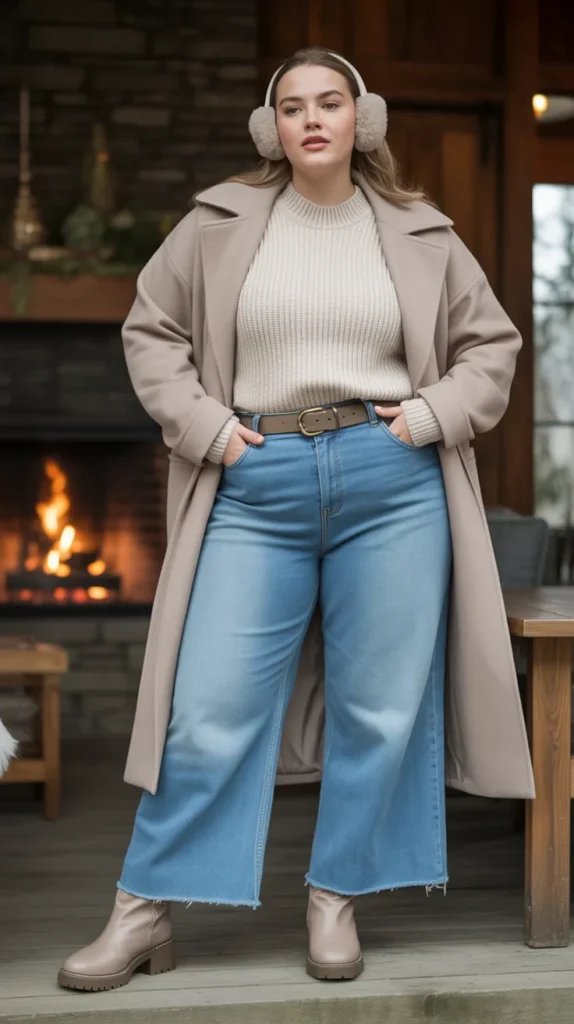 Wide-leg jeans with a chunky cream sweater and belted wrap coat make this winter outfit flattering and chic. Add knee boots and fleece-lined ear warmers for warmth. This casual winter outfit proves that cozy layers can still look stylish. Cold weather outfits like this are made for feeling confident and comfy. A mode casual favorite for girls who want style and comfort.