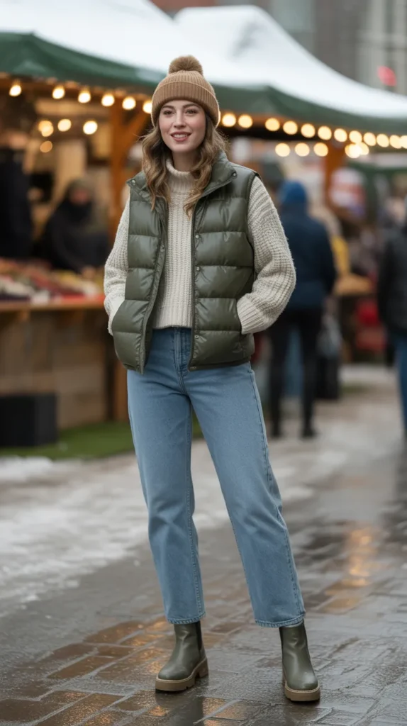 Straight-leg denim paired with a knit base and quilted puffer vest is casual winter outfit perfection. Add ankle boots and a wool beanie for everyday wear. This is one of those casual day outfits that you’ll keep coming back to. Cold weather outfits don’t need to be fancy to look chic. A mode casual look that’s timeless and practical.
