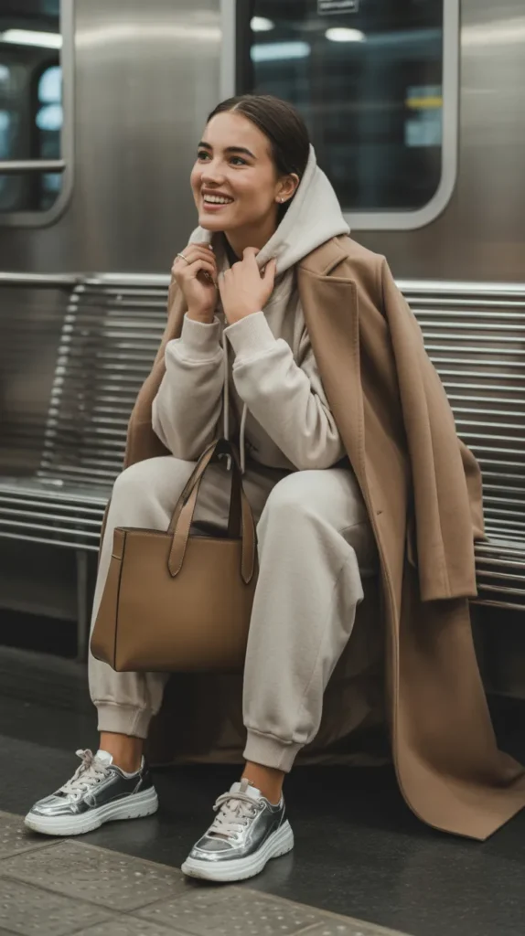 Casual never looked so chic pair a cashmere hoodie with matching joggers and throw on a longline coat. Leather sneakers and a structured tote finish the vibe, turning simple loungewear into mode casual magic. This is one of those casual winter outfits that work for travel days or weekend coffee runs. Cozy yet stylish, it’s an everyday win. A winter outfit that balances comfort and polish perfectly.