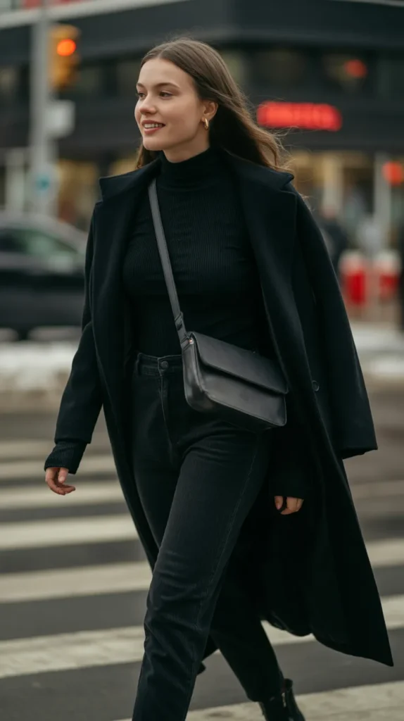 Go sleek with a head-to-toe black winter outfit: thermal top, tailored trousers, and a wool coat. Add ankle boots and a leather crossbody bag to keep things elevated. This is one of the easiest casual winter outfits to pull together and it always looks chic. Cold weather outfits in all black feel timeless and powerful. A casual day outfit that’s simple but so stylish.