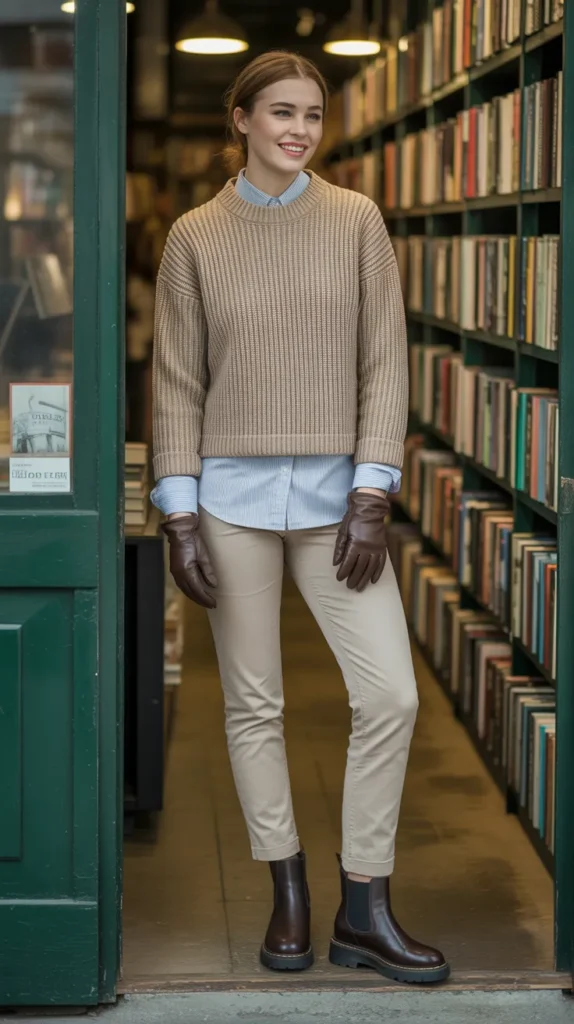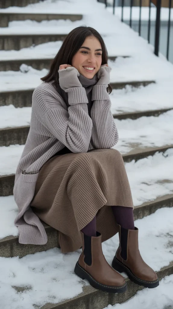 An oversized cardigan layered over a ribbed midi skirt creates feminine and cozy winter looks. Add tights, Chelsea boots, and fleece-lined gloves for polished cold weather outfits. This casual day outfit blends comfort with a touch of sophistication. Casual winter outfits like this show that knits can be chic. Mode casual layering done right.