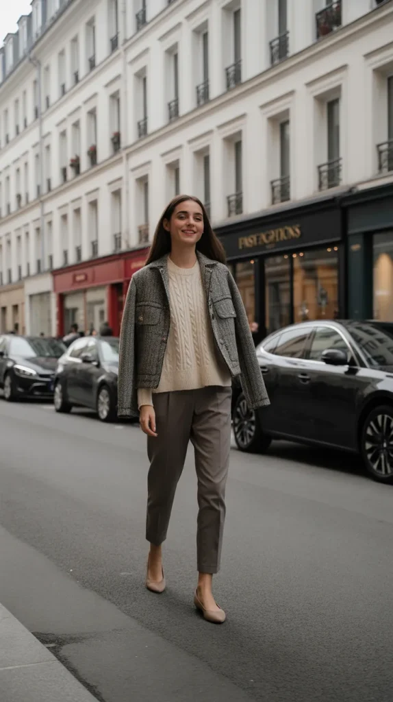 A cashmere sweater layered under a tweed jacket with slim pants and ballet flats feels straight out of Paris. This winter outfit is equal parts cozy and refined effortlessly classy with a hint of vintage charm.