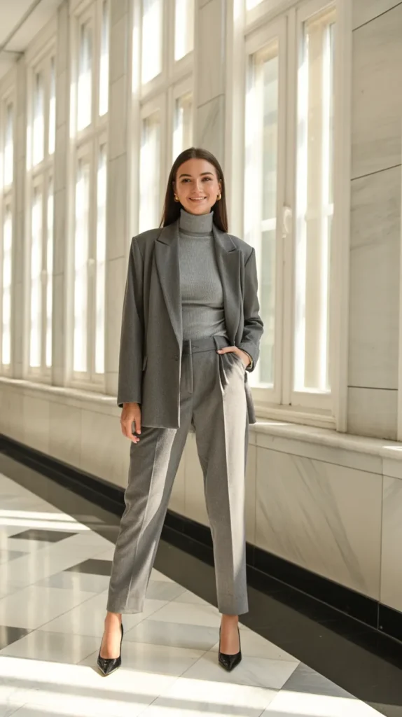 Go for a wool suit set with a turtleneck and pointed-toe heels for a power look that’s both warm and sophisticated. It’s the definition of classy winter fashion strong lines, soft textures, and undeniable confidence.