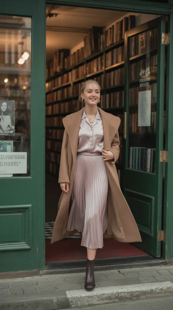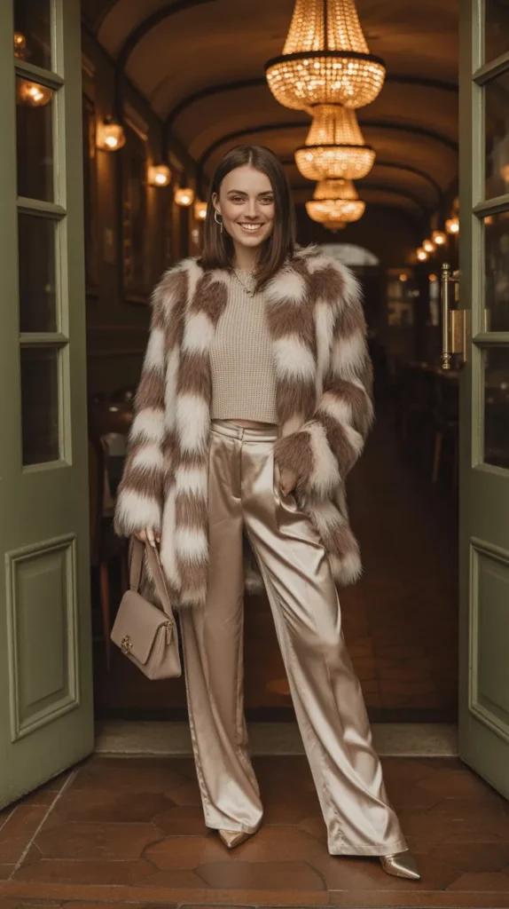 A faux fur coat worn with satin trousers, a knit top, and heels delivers vintage glamour with a modern twist. It’s bold, refined, and perfect for holiday dinners or evening events.