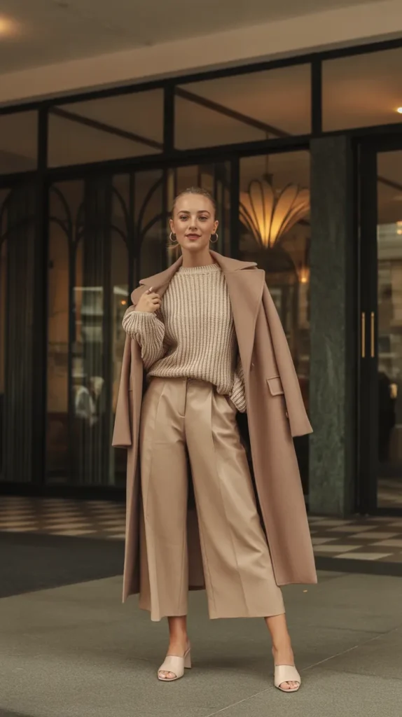 A structured coat worn with a knit top, culottes, and heeled mules captures understated grace. It’s one of those classy outfits that quietly makes an impression comfortable, elevated, and oh-so-modern.