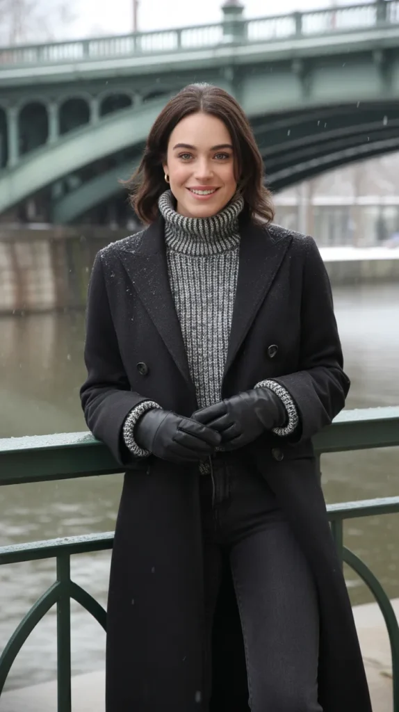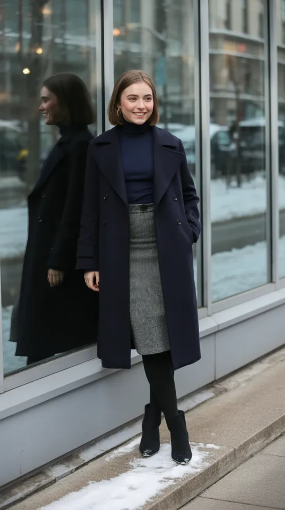 Pair a peacoat with a turtleneck, pencil skirt, and heeled boots for a balanced, structured silhouette. It’s feminine without fuss, professional without stiffness the ideal classy winter outfit for office days or chic city strolls.