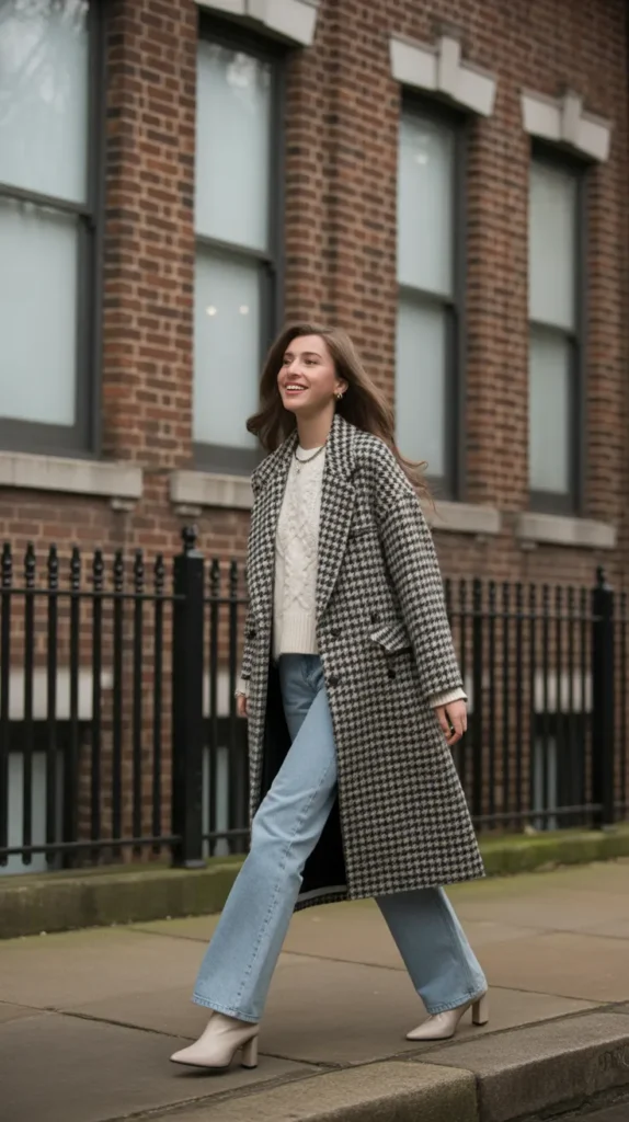 A houndstooth coat with a cream sweater, slim jeans, and heeled boots is an instant style classic. It’s the perfect mix of pattern, texture, and timeless elegance for winter fashion that never fades.