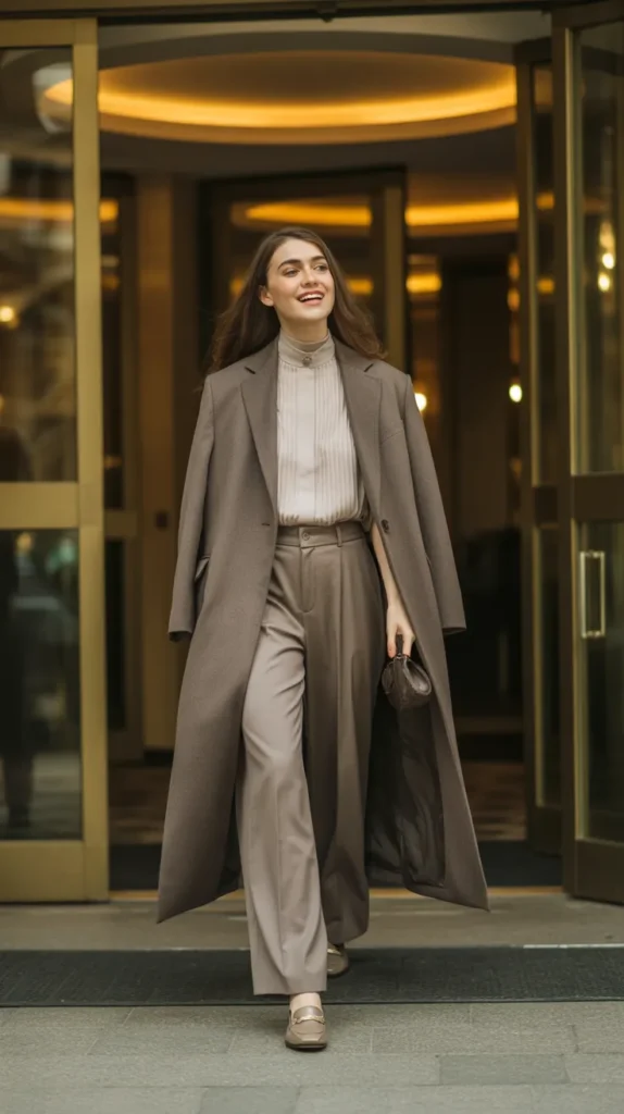Finish strong with a tailored overcoat, high-neck blouse, wide-leg slacks, and loafers. It’s crisp, composed, and radiates quiet confidence the true essence of classy winter outfits.