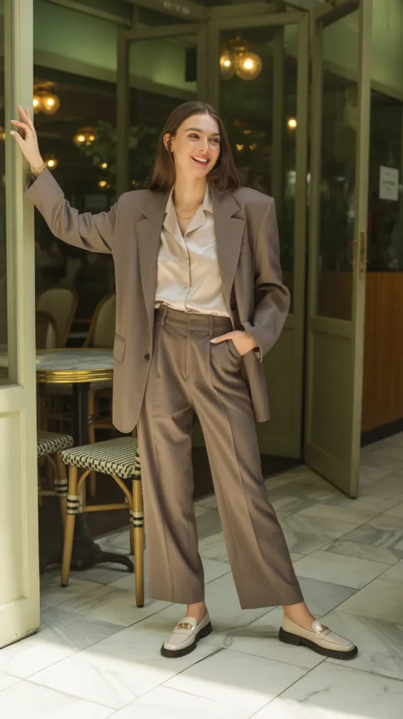 Pair a long wool blazer with a silk blouse, tailored slacks, and loafers for an effortlessly refined day look. This combo feels confident, modern, and ready for everything from client lunches to afternoon coffee breaks. It’s giving polished boss energy, and we love it.