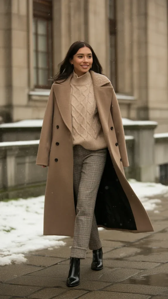 Few things say classy winter fashion like a camel wrap coat layered over a cream turtleneck with wide-leg wool pants and heeled boots. It’s cozy, timeless, and radiates that quiet luxury aesthetic perfect for mornings that start chilly but end with compliments.