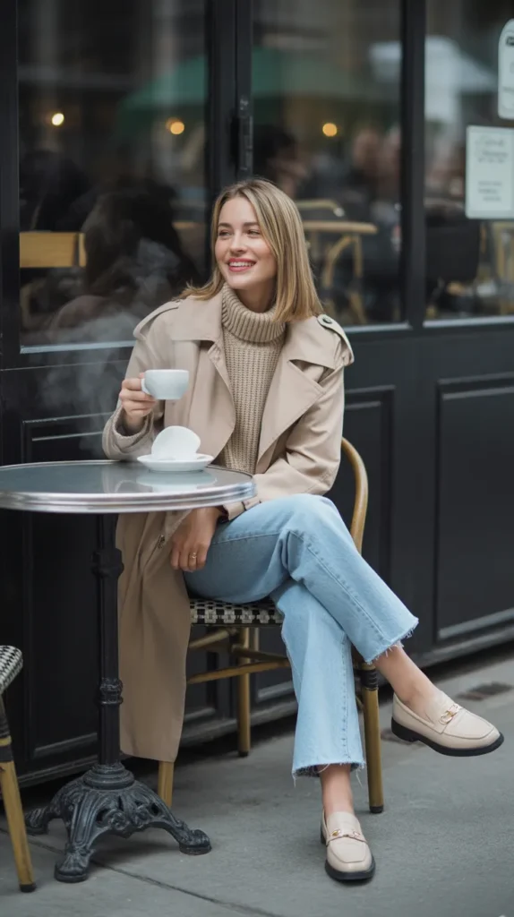 A trench coat layered over a knit sweater, straight jeans, and loafers creates a seamless weekday-to-weekend look. It’s simple, chic, and one of those classy winter outfits that never feels overdressed just effortlessly right.
