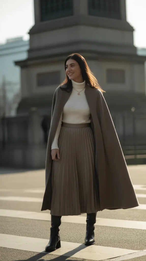 Drape a wool cape over a turtleneck and pleated midi skirt, then finish with tall boots. The movement, the drama, the timeless charm it’s like walking out of a classic film, only cozier.