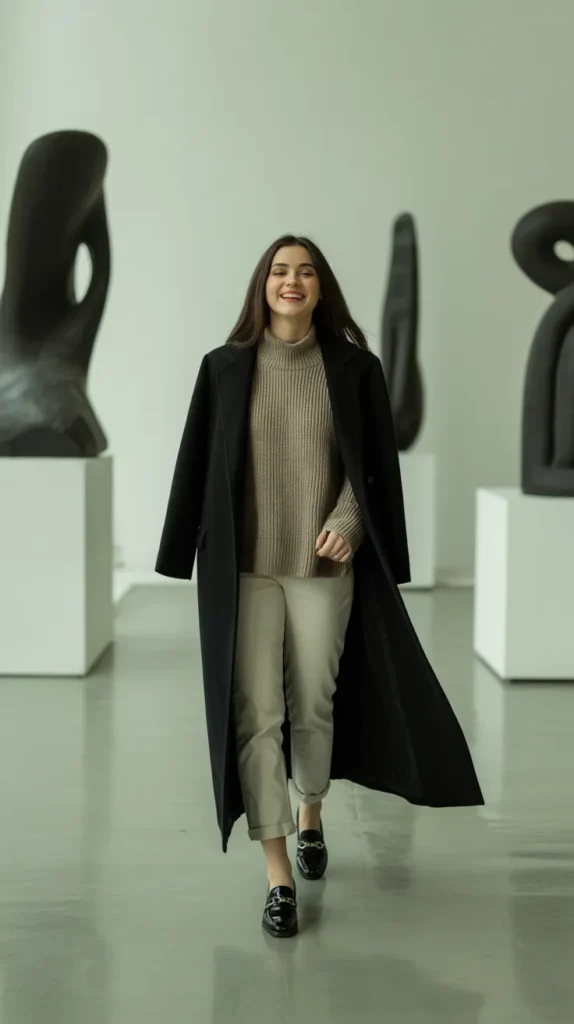 A longline coat with a ribbed sweater, cropped pants, and heeled loafers makes winter minimalism look elevated. It’s clean, polished, and quietly powerful perfect for those “less is more” moments.