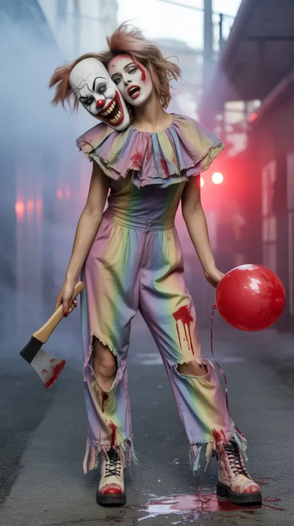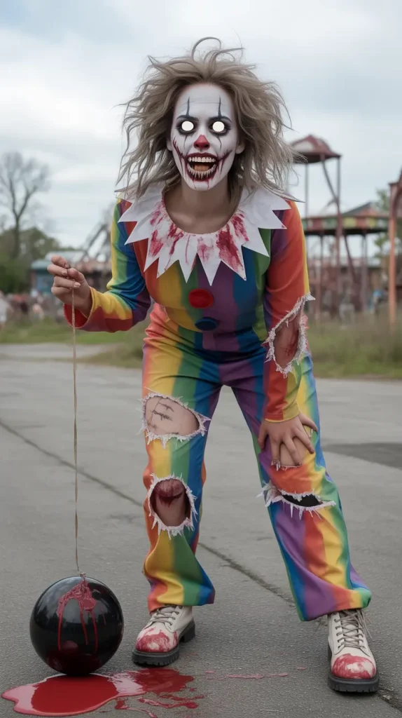 Of course, we canβt ignore the scary side of clowns. A tattered jumpsuit, bloody ruffle collar, smeared lipstick, and sharp teeth mask will give anyone chills. This version taps into horror-movie energy, which always works for Halloween. Donβt you love when a costume actually gets gasps? Itβs bold, scary, and completely unforgettable. If you want to lean heavy into creepy vibes, this is the clown costume for you. Bonus: carry a fake bloodied weapon for extra effect.