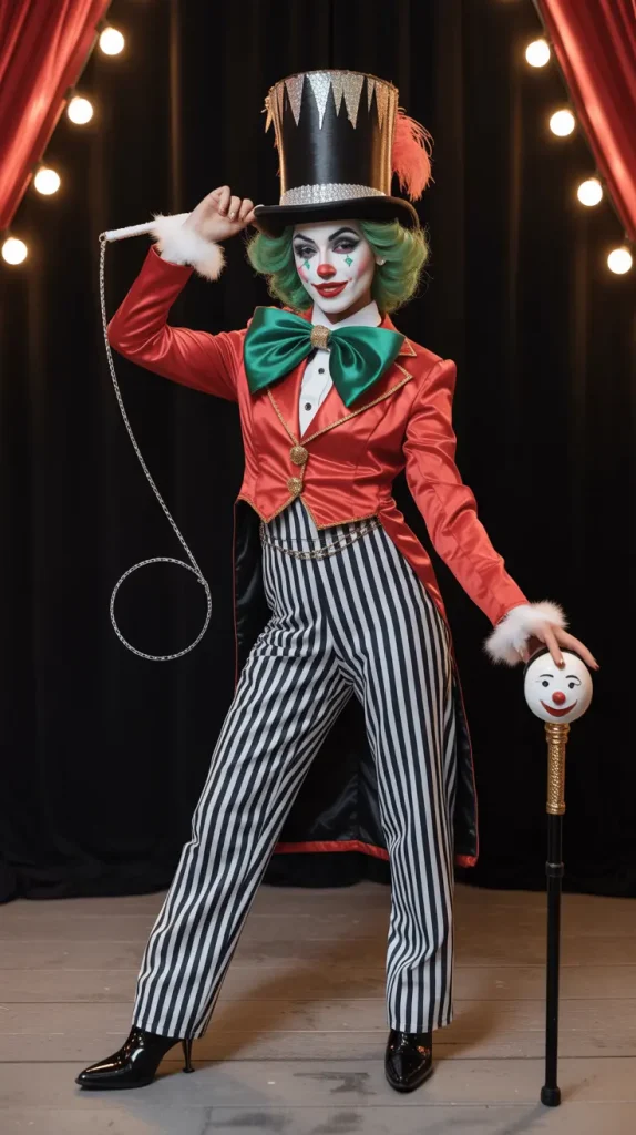 Want something flirty and stage-ready? The Burlesque Circus Clown is glamorous. A sequin bodysuit with feathered collar, garter belts, and a top hat veil takes it from costume to showstopper. Doesnβt it sound like a Vegas performance look? This oneβs perfect for parties where you want to shine under the lights. Add dramatic lashes and glitter makeup to finish the vibe. Itβs bold, sparkly, and definitely a clown Halloween costume that slays.