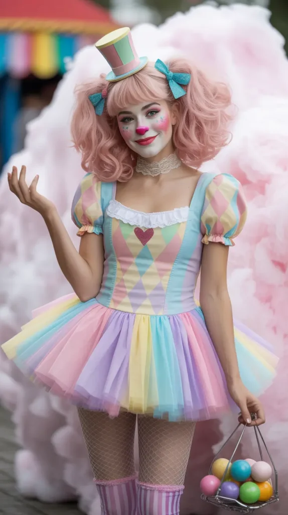 For something playful and girly, the Cute Harlequin Clown is adorable. Imagine a pastel diamond-pattern romper, mini top hat, rosy cheeks, and playful pigtails. Doesnβt that sound like candy-colored fun? This style leans more into cute cosplay energy than creepy vibes. Itβs great for anyone who wants their clown costume women look to feel sweet and approachable. Add glitter makeup or sparkly shoes for extra magic. Youβll look like you just stepped out of a whimsical storybook.