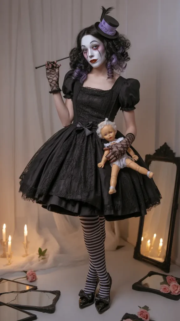 Hereβs a darker but fashion-forward choice: the Gothic Lolita Clown. A black lace dress with striped stockings, miniature hat, and porcelain makeup creates a hauntingly chic vibe. Think Victorian elegance meets spooky fun. Ever noticed how black-and-white costumes always look a little extra polished? This one nails that balance. Itβs perfect if you want your clown Halloween costume to feel stylish rather than over-the-top silly.