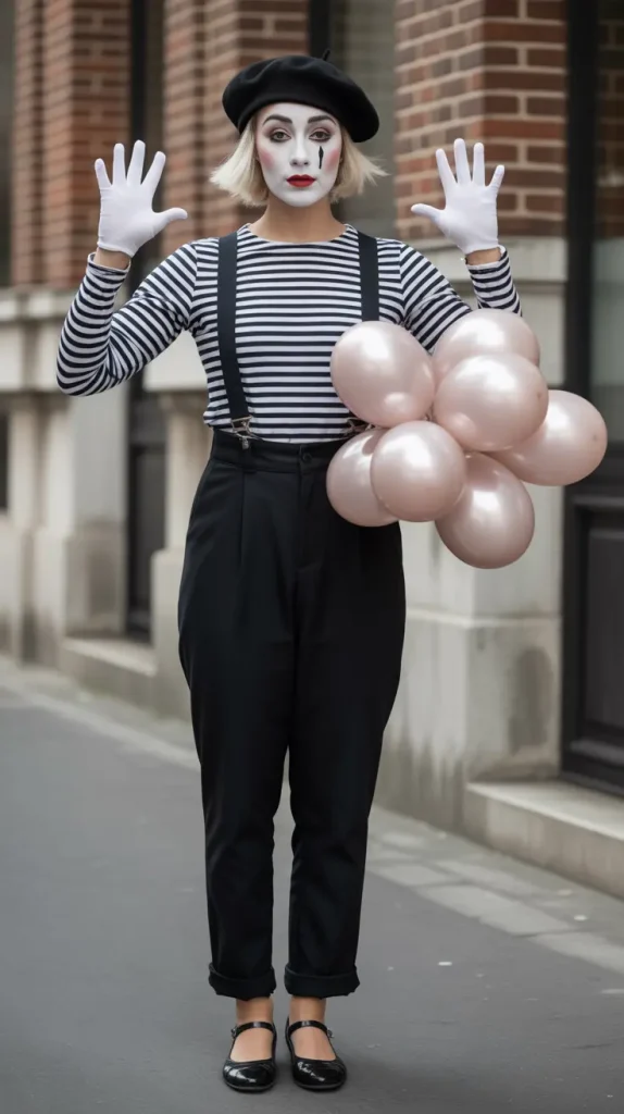 Minimal but iconic, the Mime Clown is a Halloween favorite. A black beret, striped shirt, suspenders, white gloves, and exaggerated tear makeup do all the work. Isnβt it nice when a costume is instantly recognizable without being complicated? This look has a subtle charm that feels timeless. Plus, itβs super easy to put together from pieces you might already own. This is the kind of clown costume women can wear if they want low effort but maximum impact.