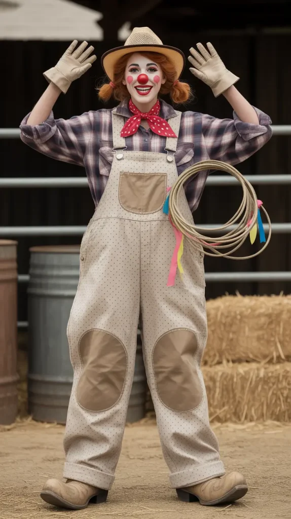 For playful country vibes, try the Classic Rodeo Clown. Baggy polka-dot overalls, a patched shirt, cowboy hat, and a big red nose make this look perfect. Itβs fun, campy, and just a little nostalgic. Donβt you love costumes that feel like they belong in a carnival show? Add exaggerated boots or painted freckles to push the rodeo angle. This version keeps your clown style lighthearted and easygoing.