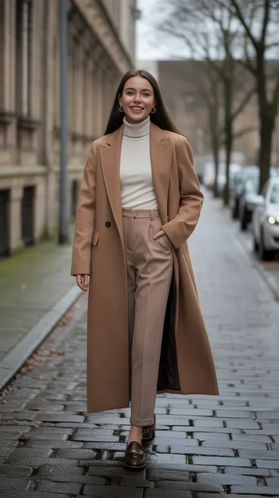 A long wool coat paired with a turtleneck and tailored trousers creates an instant air of city sophistication. Add loafers, and you’ve nailed the ultimate cold weather outfit that blends polish and practicality. It’s that quiet, timeless style that works from office mornings to dinner nights with ease.