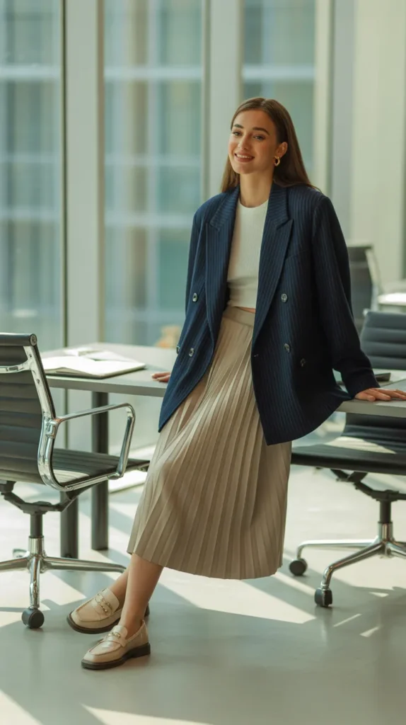 A structured blazer styled with a ribbed top and pleated skirt is the perfect balance of tailored polish and feminine flow. Add loafers, and this winter fit becomes the ideal smart-casual look for cozy offices or city walks.