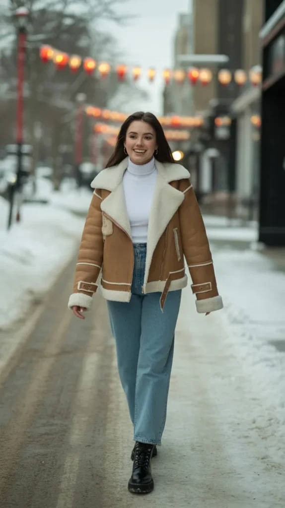 A shearling aviator jacket paired with high-waist jeans, a turtleneck, and combat boots delivers street-style perfection. This winter outfit has that rugged, effortless vibe that keeps you warm while looking totally bold.