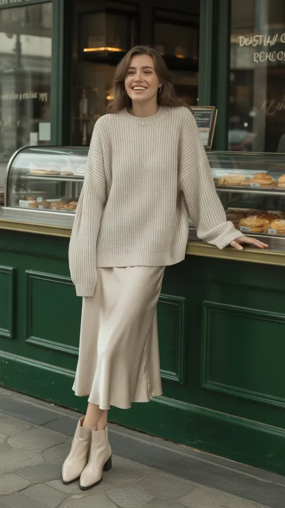 An oversized sweater tucked into a satin midi skirt with boots is cozy-chic heaven. It’s one of those winter outfit ideas that looks fashion-forward but feels like your favorite blanket. Ideal for brunches, shopping, or just feeling pretty on cold days.