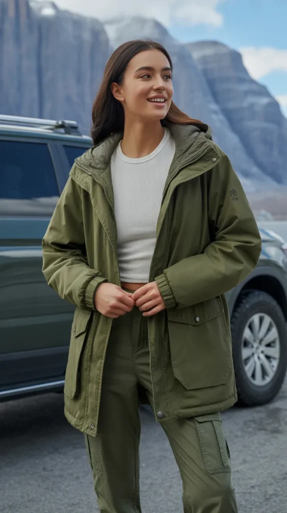A parka layered over a thermal top, cargo pants, and snow boots is built for real winter weather. It’s functional without sacrificing style, making it one of those cold weather outfits that’s perfect for travel or mountain getaways.