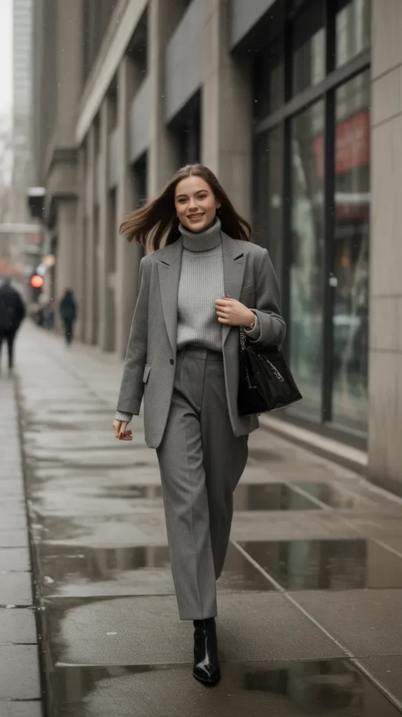 A wool suit set with a roll-neck sweater and ankle boots redefines business winter style. It’s warm, sleek, and timeless a winter fit that works for professional settings or classy lunch dates alike.