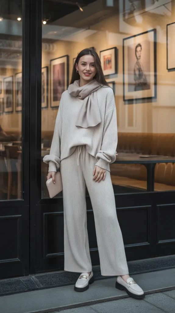 A knit set paired with an oversized scarf and loafers is minimalism done right. This cold weather outfit is soft, cozy, and effortlessly stylish perfect for casual workdays, travel, or slow weekends spent in warmth and style.