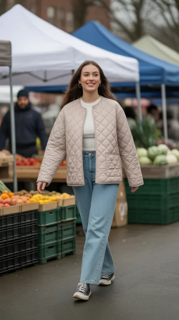 A quilted jacket layered over a long sleeve tee and straight jeans is the ultimate casual essential. Add sneakers, and this cold weather outfit is instantly wearable the kind of go-to you’ll reach for all winter long.