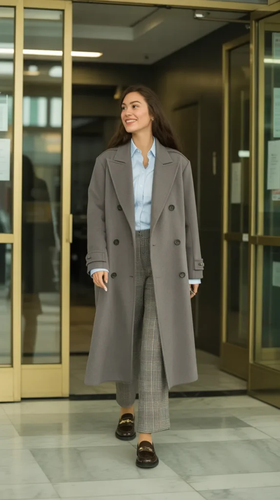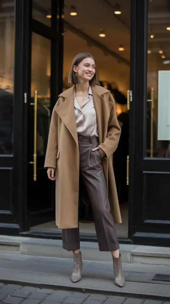 A wrap coat paired with a silk blouse and cropped trousers feels crisp, classy, and modern. Add pointed boots for a chic, professional finish. This winter outfit idea is perfect for creative offices or stylish evening events.