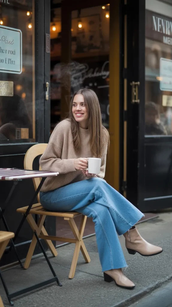 A chunky knit sweater teamed with wide-leg jeans and ankle boots delivers the perfect balance of cozy and cool. It’s a casual winter fit that feels effortless but still pulled together ideal for chilly brunches or slow weekend strolls.