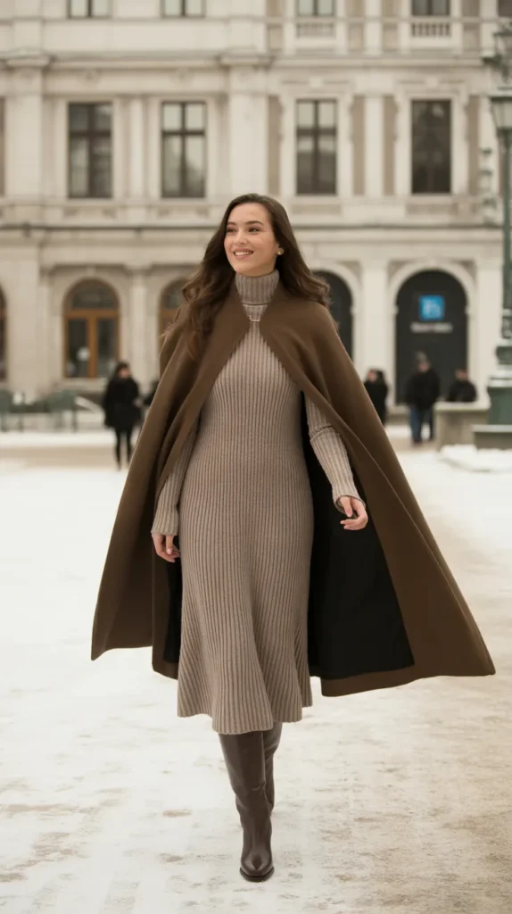 A wool cape layered over a knit midi dress and styled with knee boots delivers pure winter drama in the best way. This cold weather outfit is elegant, striking, and perfect for women who love to make an entrance while staying cozy.