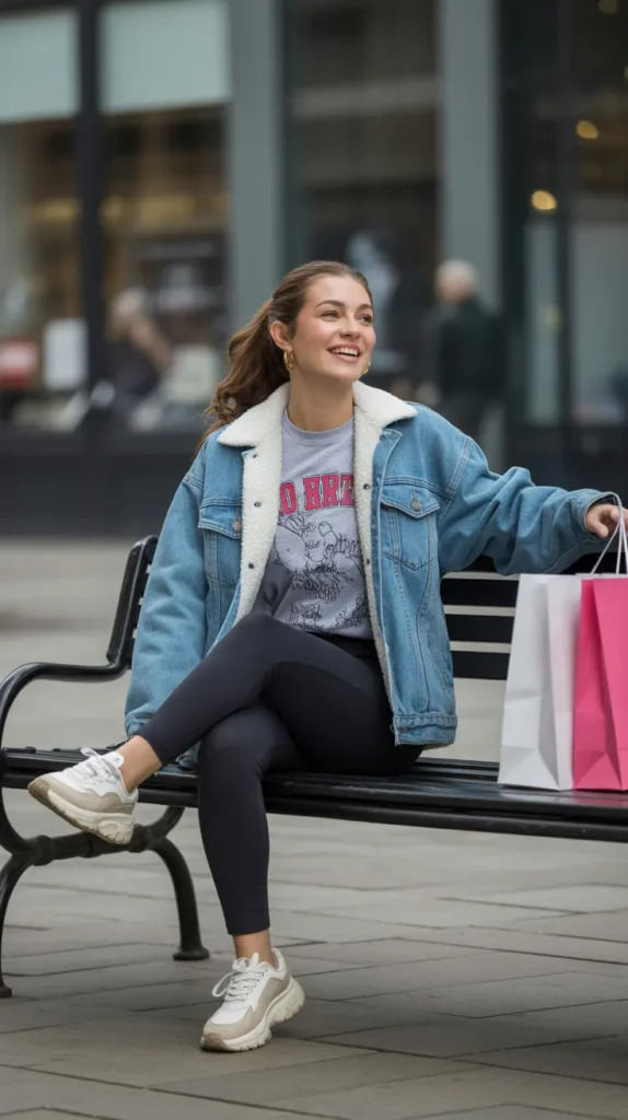 A denim sherpa jacket with a graphic tee, leggings, and chunky sneakers nails that off-duty casual energy. It’s warm, trendy, and perfect for weekend hangouts. This winter fit is proof that looking cool doesn’t mean feeling cold.