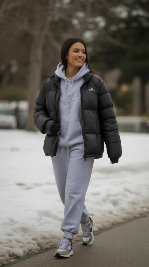 A puffer jacket over a hoodie and joggers is the definition of casual comfort. Pair it with sneakers, and this winter outfit idea becomes your go-to for errands, travel, or simply embracing cozy streetwear energy.