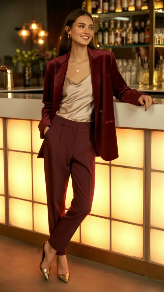 A velvet blazer layered over a satin cami and tailored trousers is pure evening elegance. Add heels, and you’ve got a winter outfit that’s sophisticated yet festive perfect for parties or dinner plans when you want to shine without freezing.