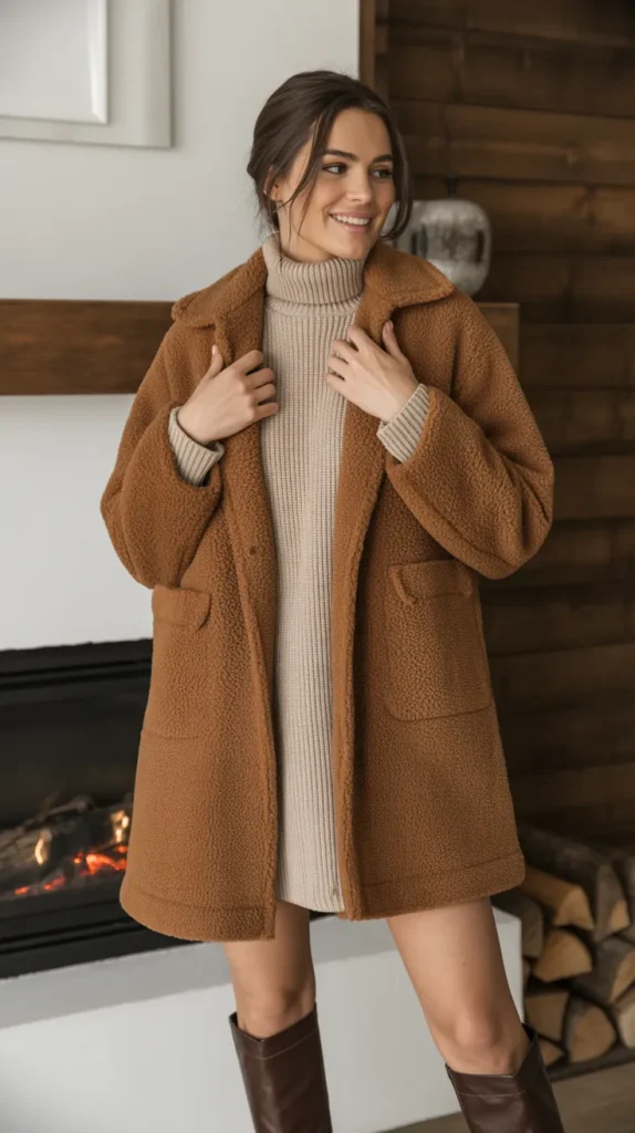 Wrap up in a teddy coat and layer it over a knit dress with knee-high boots for cozy sophistication. This soft, textured winter fit feels warm yet refined ideal for coffee dates, city strolls, or nights out when comfort meets confidence.