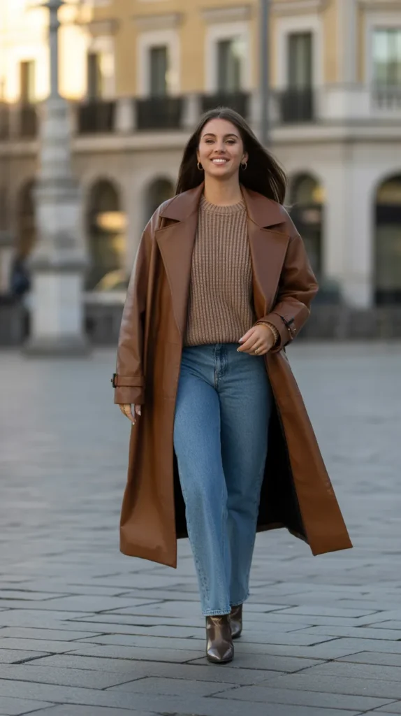 A leather trench paired with a crewneck sweater and straight jeans gives off modern sophistication. Add heeled boots for height and structure. This winter outfit is edgy yet wearable perfect for those “I didn’t try, but I still look amazing” moments.