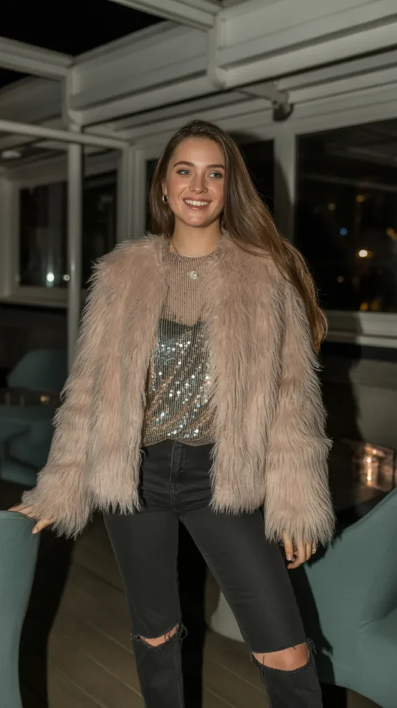 A faux fur jacket worn over a sequin top and black jeans gives instant festive glam. Add ankle boots, and you’ve got a winter fit that’s equal parts sparkle and comfort ideal for holiday nights when you want to stay warm but dazzle too.